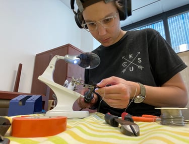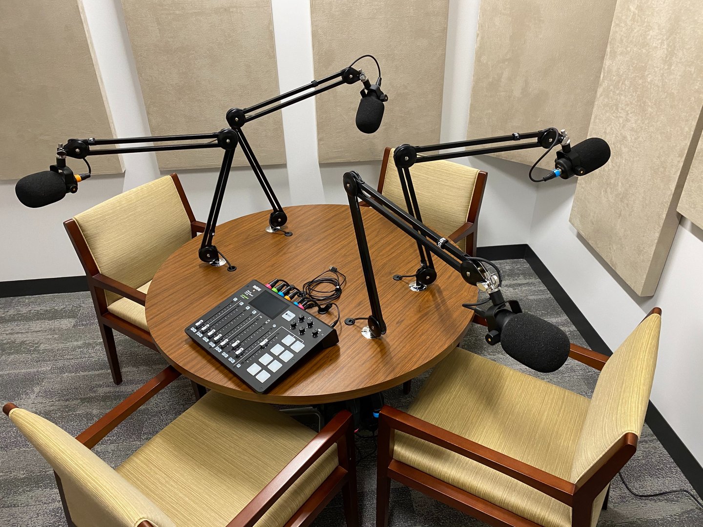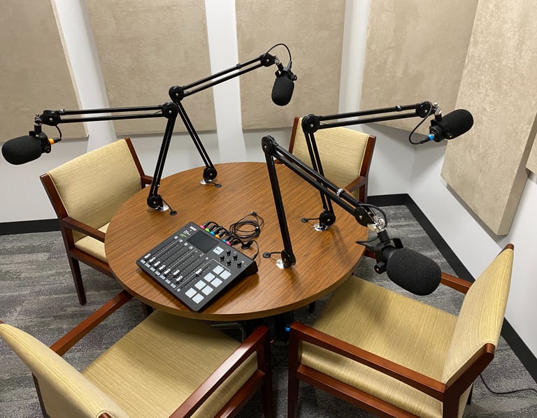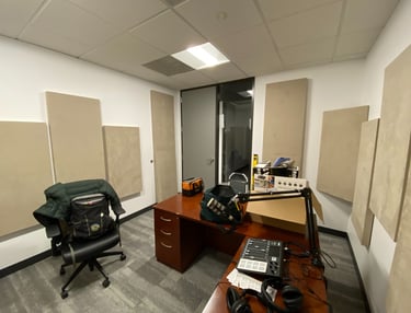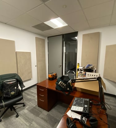Hans transformed a 10' X 12' office space into a 4-person recording studio for the Colorado State University Spur Campus. He installed Acoustimac sound panels to absorb echo in the room. To keep the space easy to use and sounding pro-grade, the studio utilizes Rodecaster Pro audio interface and microphones. Hans used a soldering iron and hole saw to keep all cables and equipment clean and accessible on a small recording table.